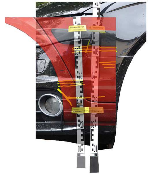 Wir führen für Sie Fahrzeuggegenüberstellungen durch. Somit lassen sich in der Regel unklare Sachverhalte auch im Nachhinein noch klären. Hierbei arbeiten wir ebenfalls mit modernster Technik. So werden die kausalen Schadenbereiche (mögliche Kontaktionsflächen) beider Fahrzeuge unter Zuhilfenahme eines Maßstabes fotografiert. Anschließend werden die gespiegelten Schadensbereiche beider Fahrzeuge auf gleichen Maßstab gebracht. Anschließend werden die Bilder, somit auch die entsprechenden Schadenbereiche, übereinandergelegt und mit einer entsprechenden Transparenz versehen.